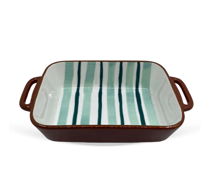 Esta travessa retangular com alça de tamanho médio é a escolha ideal para quem busca unir funcionalidade e design marcante. Seu padrão de listras em verde e azul cria um visual moderno e elegante, enquanto a alça marrom adiciona contraste e charme à composição.